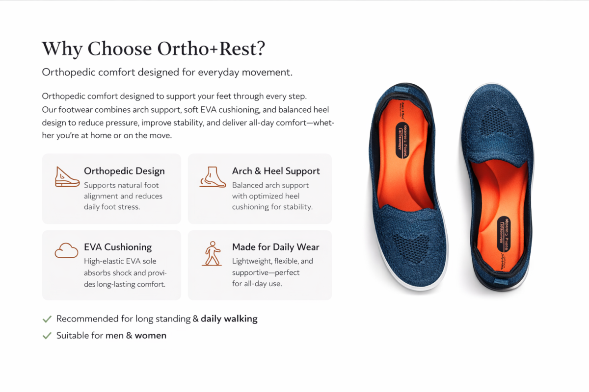 Ortho + Rest has been engineered from carefully selected and specially blended polymers keeping in mind the requirements of paining heel and foot. It provides the extra yet optimum thrust of cushioning required by an average Indian feet. Ortho + Rest may be effective in many cases. Ortho slippers’ special material provides extra comfort, it is skid and slip resistant and provides orthopedic slippers for men with symptomatic relief in the condition of aching heels and feet. As general footwear (also known as doctor soft slippers, or ortho sandals for Women & Men), its use is strongly recommended to prevent the occurrence of conditions leading to heel pain and foot pain.