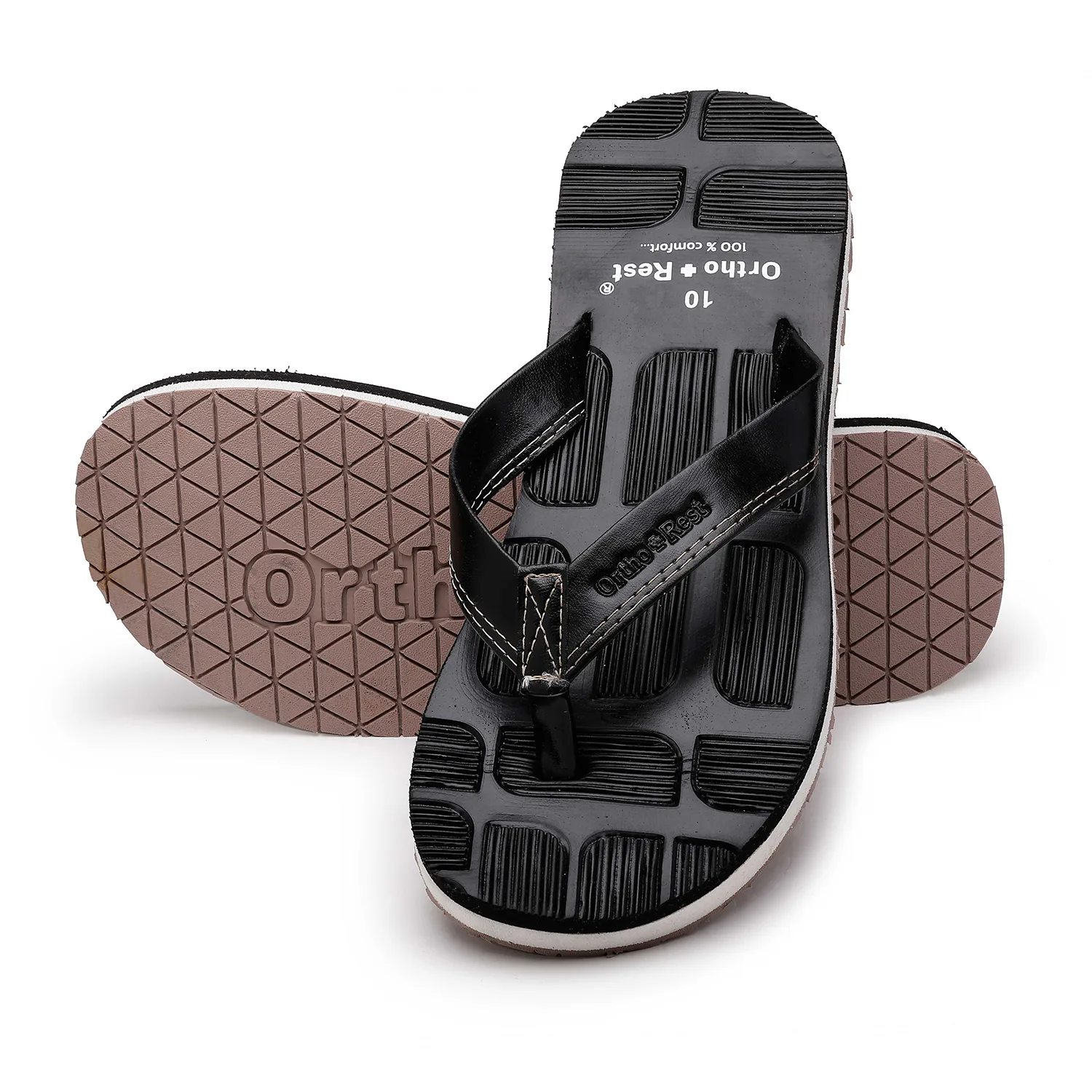 Experience ultimate comfort with the Ortho+Rest Blocked Sole Flip Flops, designed for all-day support and style. Crafted with a unique ergonomic blocked sole pattern, these flip flops offer superior grip and anti-slip protection, making them perfect for both indoor and outdoor wear. The orthopedic footbed provides targeted arch support, reducing stress on your feet and joints, while the soft, durable straps ensure a secure and comfortable fit.