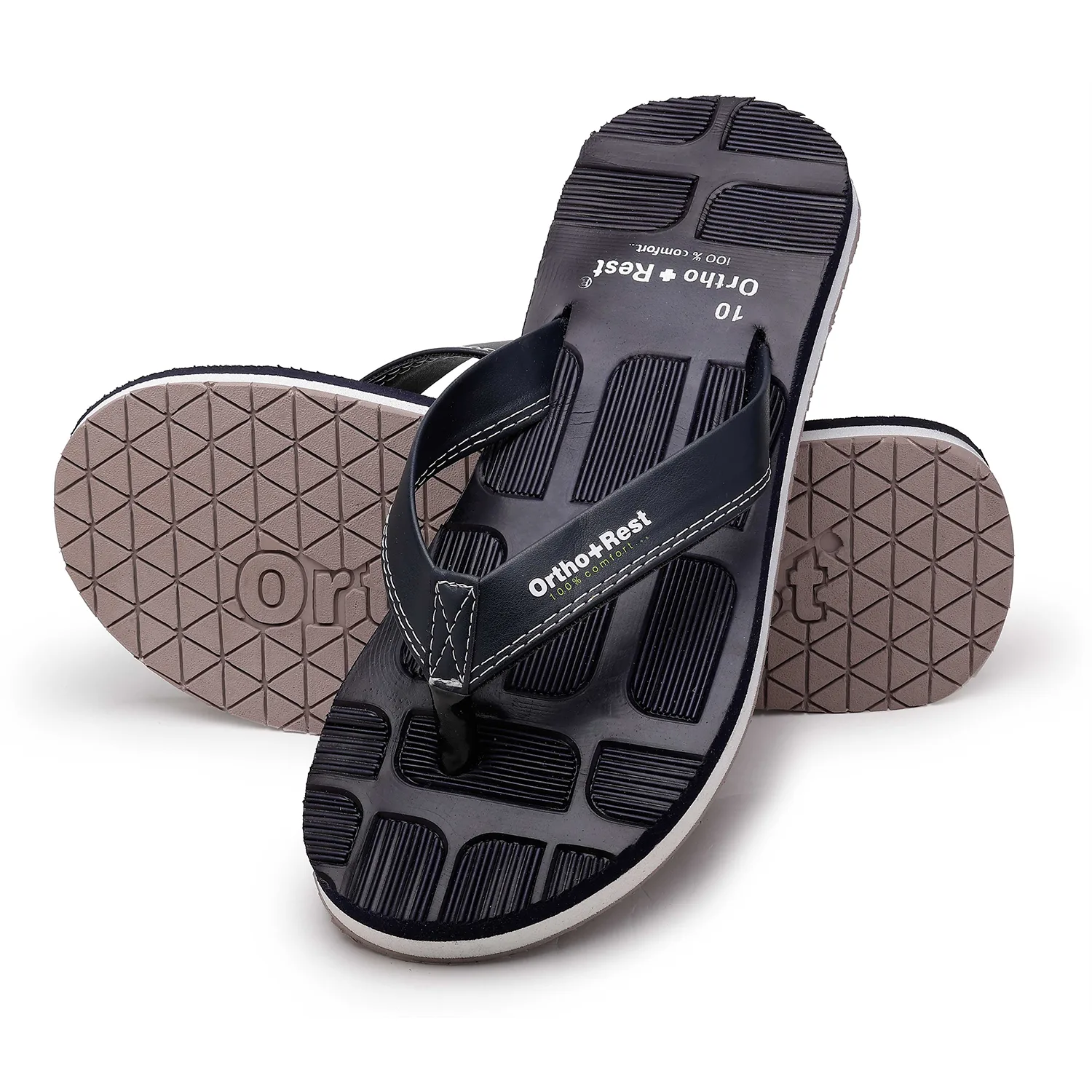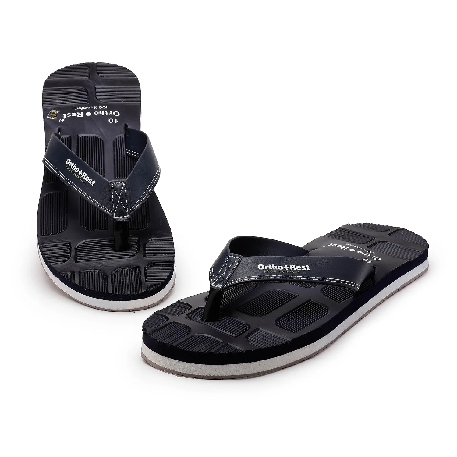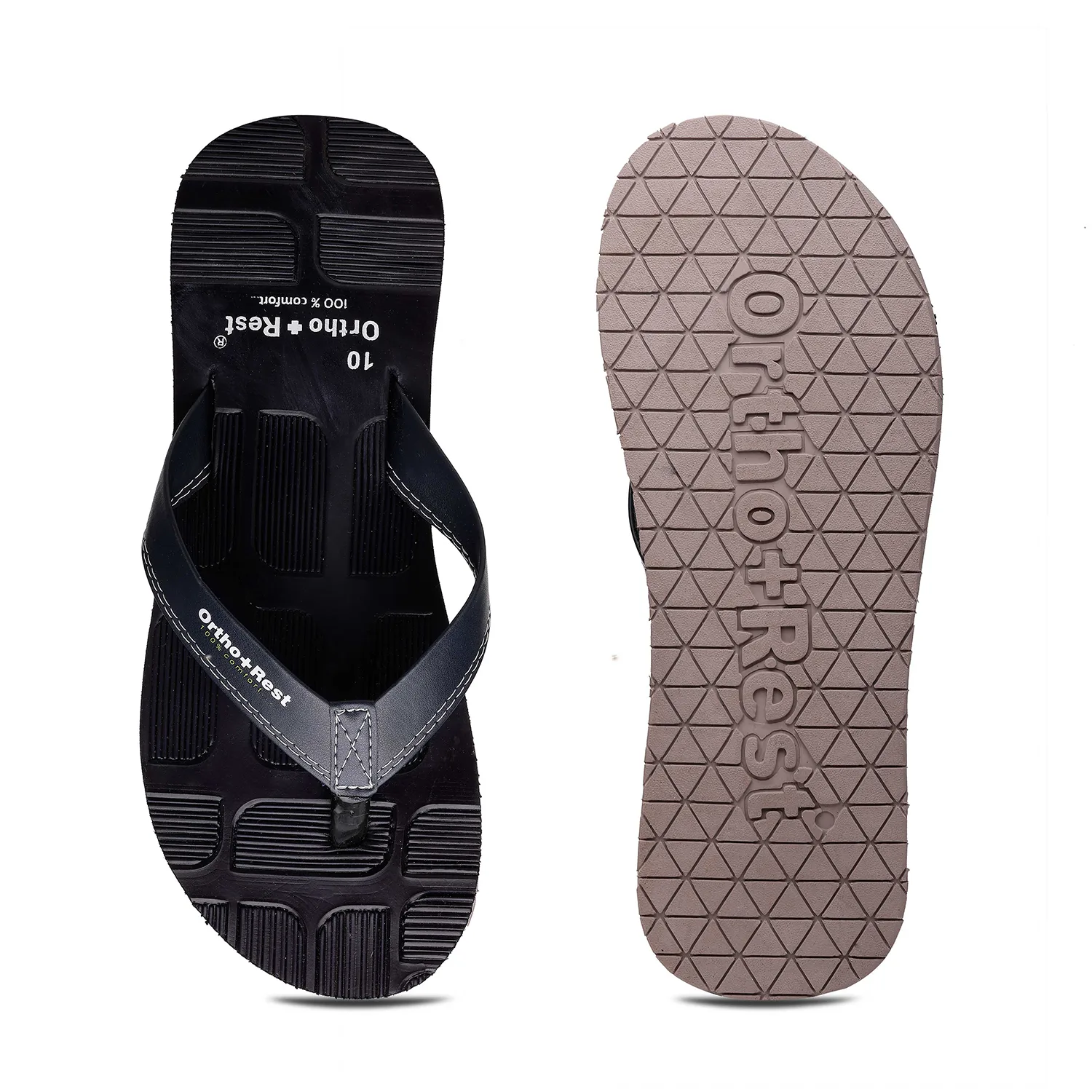 Experience ultimate comfort with the Ortho+Rest Blocked Sole Flip Flops, designed for all-day support and style. Crafted with a unique ergonomic blocked sole pattern, these flip flops offer superior grip and anti-slip protection, making them perfect for both indoor and outdoor wear. The orthopedic footbed provides targeted arch support, reducing stress on your feet and joints, while the soft, durable straps ensure a secure and comfortable fit.