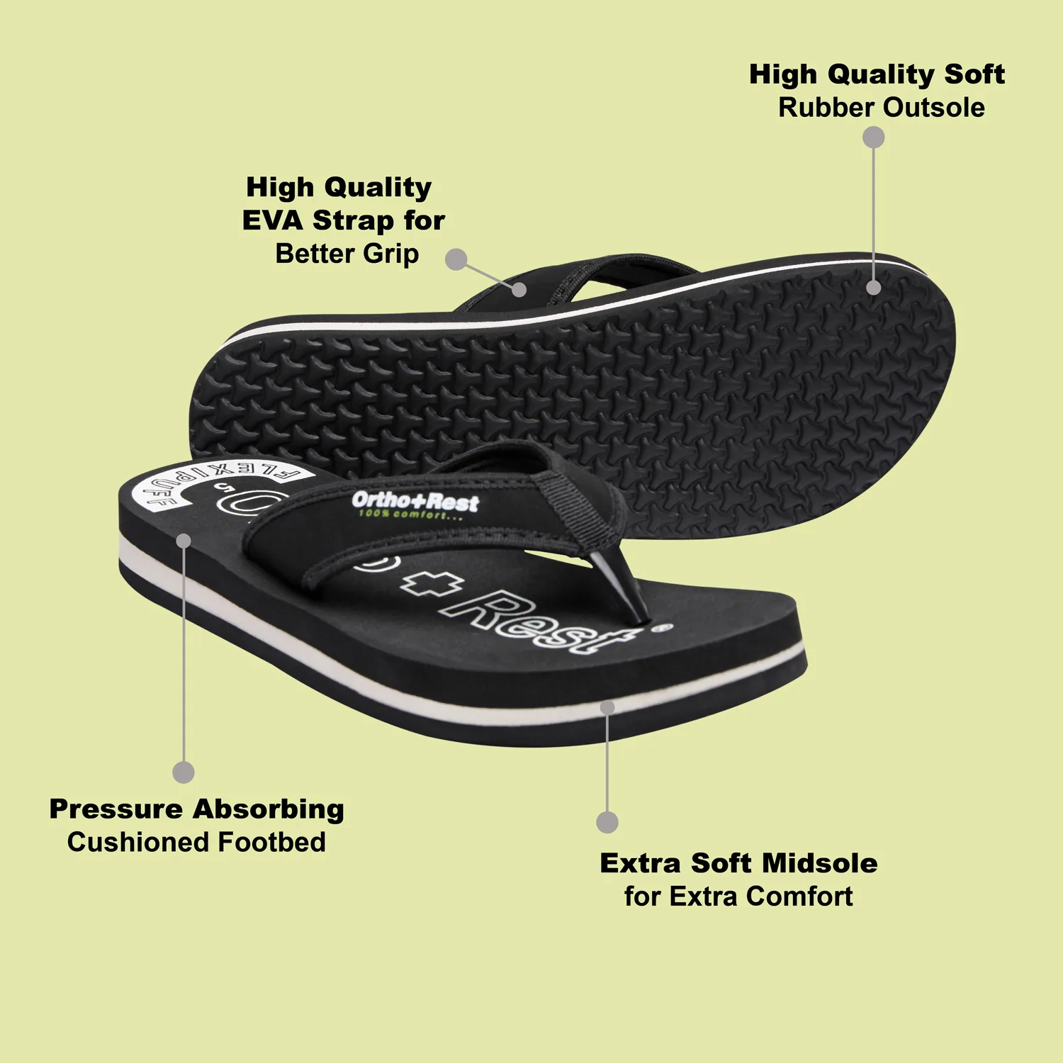Ortho + Rest slippers and sandals has been engineered from carefully selected and specially blended polymers keeping in mind the requirements of paining heel and foot.