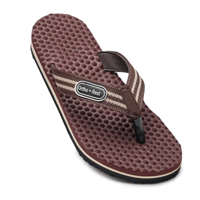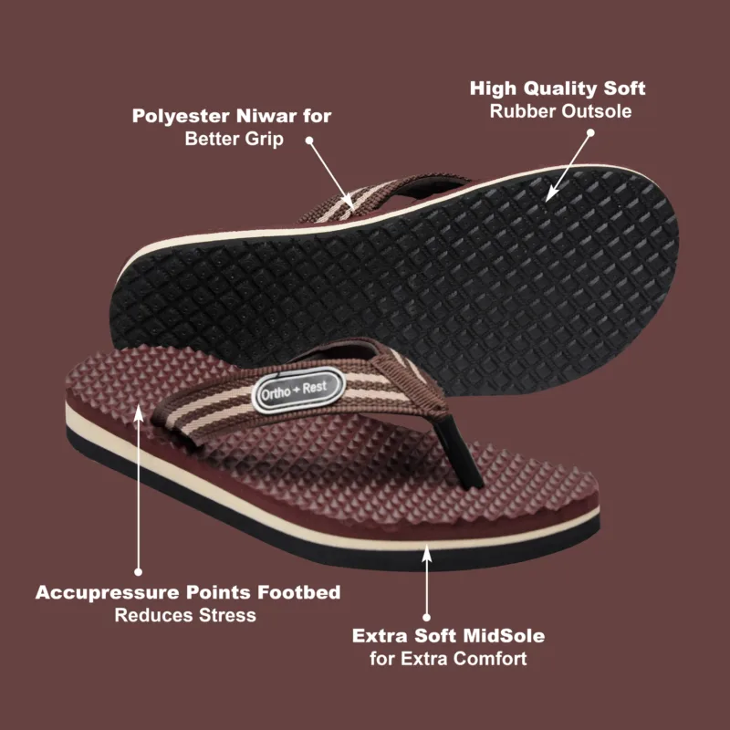 Ortho + Rest slippers and sandals has been engineered from carefully selected and specially blended polymers keeping in mind the requirements of paining heel and foot. It provides that extra yet optimum thrust of cushioning required by an average Indian feet. Ortho + Rest may be effective in many cases. It’s special material provides extra comfort, It is skid and slip resistant and provides symptomatic relief in conditions of aching heel and feet. Being an open footwear it is helpful for diabetics as injuries due to closed,tight fitting and hard soled shoes and prespiration are prevented. As a general footwear its use is strongly recommended to prevent occurance of conditions leading to heel pain and foot pain.