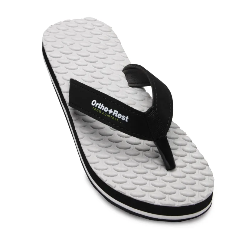 Everyone loves having black footwear and accessories. Adding comfort and style to your looks, our Black Ortho + Rest Comfort Slippers are perfect for your wardrobe. These proffer optimal convenience and mobility to the wearer while supporting the foot through its thick strap and base.