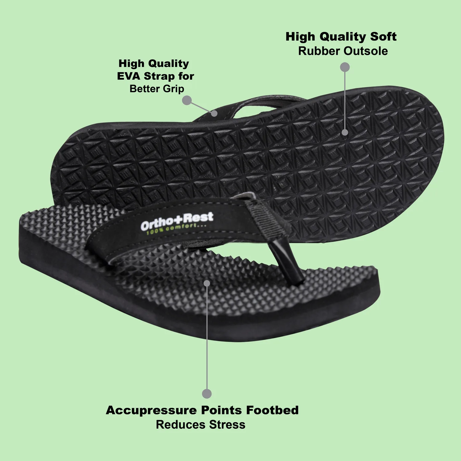 Ortho + Rest slippers and sandals has been engineered from carefully selected and specially blended polymers keeping in mind the requirements of paining heel and foot.