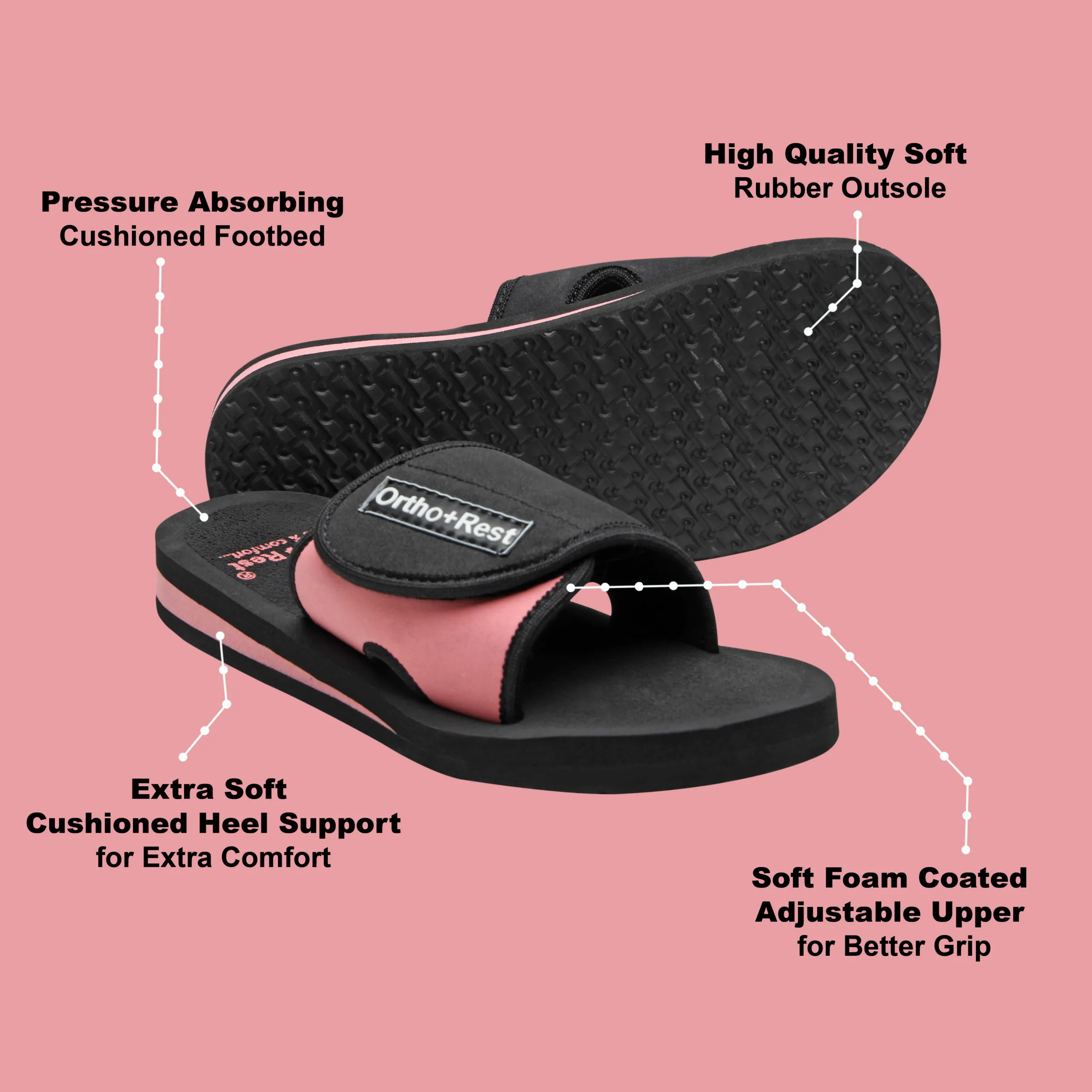 Ortho + Rest may be effective in many cases. It’s special material provides extra comfort, It is skid and slip resistant and provides symptomatic relief in conditions of aching heel and feet. Being an open footwear it is helpful for diabetics as injuries due to closed,tight fitting and hard soled shoes and prespiration are prevented.